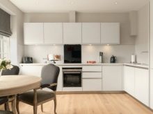 - In this case, it is shown how elegant a combination of a white headset and a light gray free part of the wall can be. Tiled floors and a modest dining group complete the composition.
