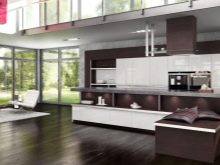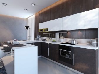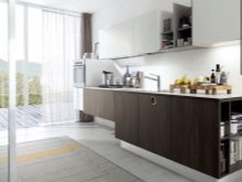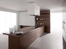 White-brown combination is very important for modern. Bet on horizontal silhouettes in brown tones, fancy patterns, custom details. As for the working area, it is made darker than the background. Both matte and glossy surfaces are welcome. Shelves can be left open, but the furniture is bought expensive, practical and functional.