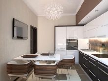 You can use brown only on one or two walls, it can be present as a pattern. It is better to equip a white suite with a dark working area so that the furniture stands out effectively against the background of the walls. It is still better to leave the ceiling as light as possible, but a brown chandelier is acceptable.