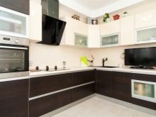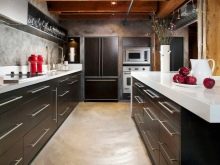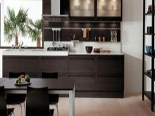 This is a very extraordinary decision, requiring a certain amount of courage. A dark background and light complementary color in the design is permissible only in a very bright and large room. Otherwise, the risk of being in a small dark and gloomy room is too great. If you decide to try to decorate the kitchen in such a combination, bet on light tones of brown. This will allow you to expand the space visually and save you from the feeling of a box of wood.