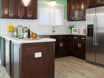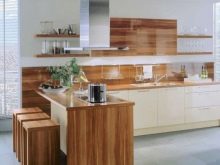 First of all, wood is associated with brown. Natural wood looks extremely impressive and status in the kitchen interior. You can choose different shades - from the lightest to the darkest dark, different textures. It is important that the wood is quality processed, otherwise, due to moisture and temperature extremes, it will quickly lose its visual appeal. An array will be quite expensive. If you need to keep within the budget amount, you should consider chipboard, MDF. Here, the choice of colors and textures is even more diverse, it is possible to imitate any shade of wood.