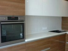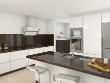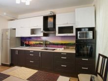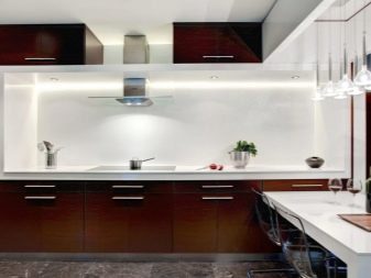 A white headset with a dark brown working area looks very impressive. It is not only beautiful, but also very practical. The countertop can be made of different materials. Stone and its imitation, wood are very popular. Particular attention must be paid to the apron. It can be decorated with ceramic tiles, glass, metal, wood. Sometimes an apron is the only, most catchy accent in the kitchen.