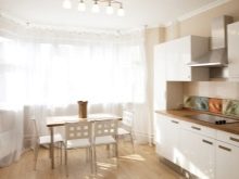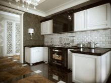A very successful combination of white and chocolate, because in the direction of art deco it looks very expensive and presentable. Traditionally, the bottom of the kitchen set is made brown; it is left for a dining table, chairs. The walls and top of the furniture should be white or cream. The floor is often laid out with light ceramic tiles, alternating it with the same brown shades that were found on the furniture. White and brown curtains will help to create a certain highlight to this style. Their length should be maximum, which will significantly increase the height of the ceiling.