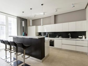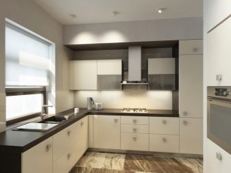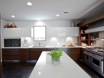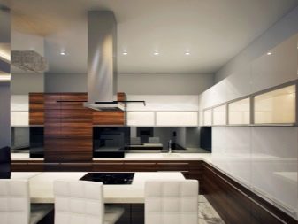It is very important to think over lighting, not stopping only on the central top. It is better if the headset is equipped with a backlight around the entire perimeter of the work surface. To make this interior look complete, add gray, black, dark brown shades to it. So you can arrange skirting boards or use patterns, ornaments in similar colors. The floor should be darker than the headset, and the chairs and the table in about the same colors.