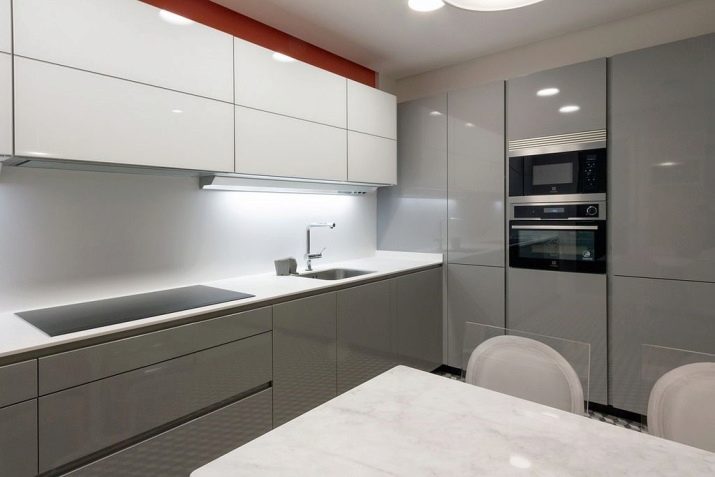 Glossy gray-white kitchen is one of the successful solutions for the interior. Do not be afraid of prints on a glossy surface. They will be less noticeable than, for example, in a black or brown kitchen.