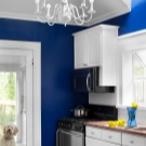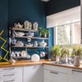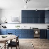 Blue color in the interior will be the dominant color scheme, regardless of its quantity. If it is not dosed, the room risks becoming gloomy, and the atmosphere is oppressive. White alone will not be enough to create the necessary mood in the kitchen. To prevent negative perception of space, you will have to dilute the design with lively colors, possibly sunny tones.