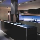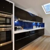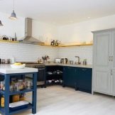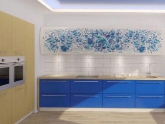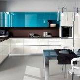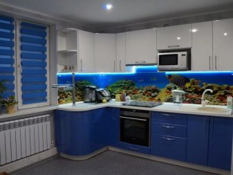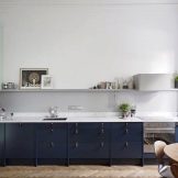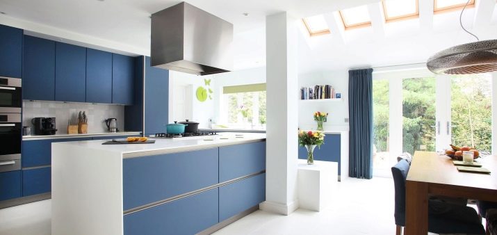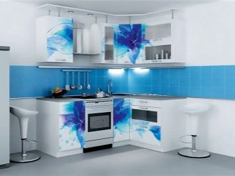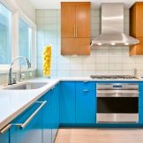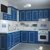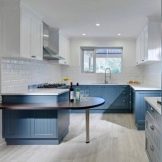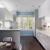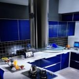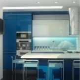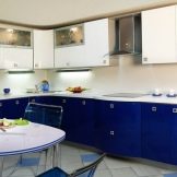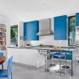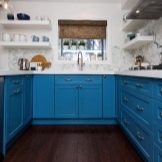 Modifications of this type successfully fit into the interior of kitchens of different sizes. The installation of furniture can be parallel with a number of floor cabinets installed along the opposite wall opposite the main (linear) headset. When choosing a model of this type, it is necessary to select tones of blue with an admixture of gray to prevent flooding of the space with a sharp color. If you need a kitchen with a breakfast bar, you should buy corner-type furniture and curved lines.