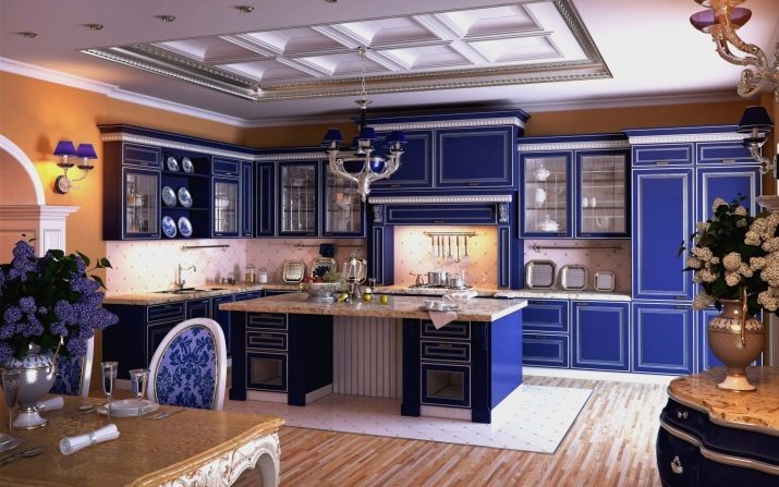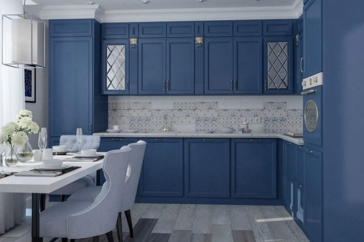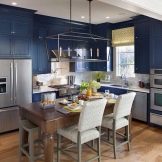 It looks stylish and spectacular; it can be supplemented by a glass storage system hanging from the ceiling. Chairs in this case are selected to match the general concept of style. Furniture for a dining group or guest corner should not be completely blue. It is quite enough to decorate the table with a tablecloth of a related color.