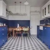 The white and blue kitchen may be different: there are models on sale with a light top and a dark bottom, varieties with different color hinged and floor cabinets. It is important to consider the footage of the room and the height of its walls. For example, white boxes will visually extend the ceiling, making it more spacious. If the kitchen does not have hinged drawers, you can beat the design by means of cantilevered shelves or racks.
