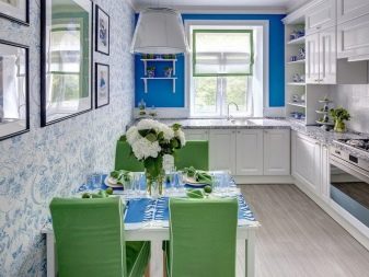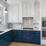We offer several examples of a successful color scheme in the interior of a white and blue kitchen: