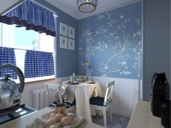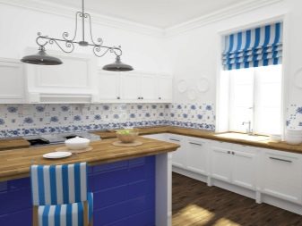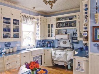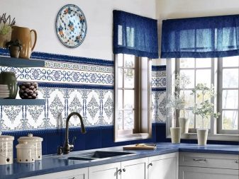 It’s easier to understand how to use accents based on the resources of a certain style. For example, for Provence or Gzhel styles, these can be plates with a blue pattern placed on open shelves or in display cabinets. They will support the direction of the curtain with a specific blue pattern (flowers, stripes, cage, plants, leaves, abstraction).