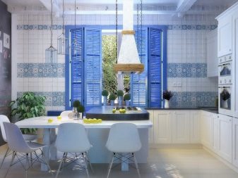 Under the kitchen in white and blue contrast is meant an interior composition using a headset and elements of arrangement in the same colors. Essentially, it could be: