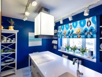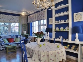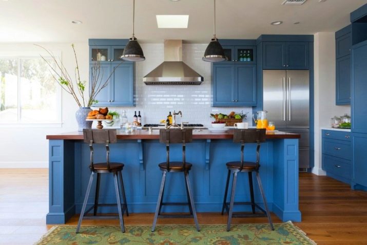Do not make the walls blue in a room with an identical interior. This simplifies the design, making its perception boring. At the same time, it is necessary to use blue color so that the room does not visually gather in one direction in the place where the kitchen furniture is installed. Color can become a zoning element of the available space. In this case, you can use for accents both light and dark blue tones.