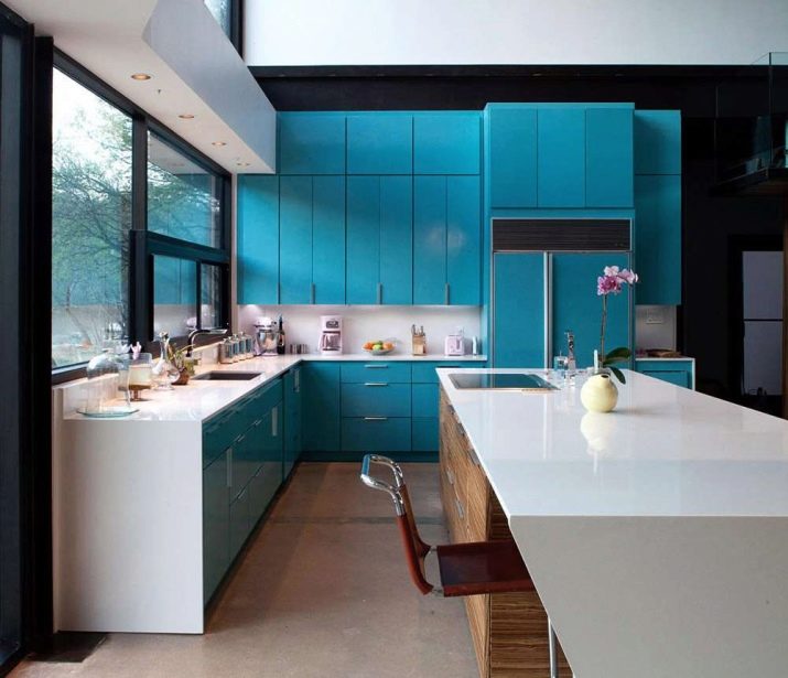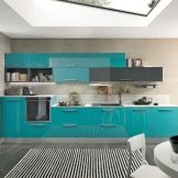 In the event that the kitchen is selected in turquoise color, you need to pay attention to the facades made of plastic or MDF. In addition, glazed cabinets with a frame made of aluminum profile will look great. Most often, turquoise-colored kitchens are distinguished by a glossy surface.
