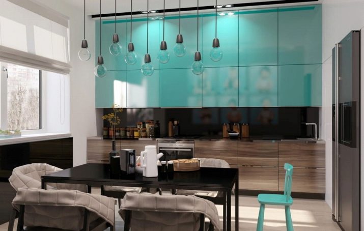 It is very important for the kitchen to choose the right lighting. Only in this case the turquoise cuisine will look attractive not only in the afternoon, but also in the evening. For example, bright white light will help to emphasize matte surfaces. But in a room with glossy facades it is better to use cold lighting. If the light is yellow, the turquoise hue will appear greenish. You can use LED strips for lighting, as well as beautiful turned lamps, located above the desktop. This will also help to zone the room.The same applies to sconces, which are most often located either in the dining area or near the work surface.