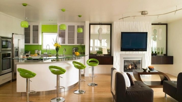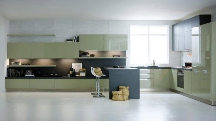 The set and the appropriate dining group should be chosen based on the style in which the kitchen is designed. The headset can be straight or angular, it does not matter. In a small kitchen, a corner model is better; in a more spacious one, a direct model or a kitchen with an “island”. Pistachio looks beautiful in kitchen sets with an integrated bar counter.