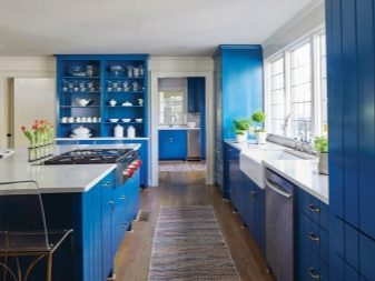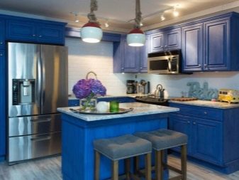 - Blue - also applies to calm colors and sets for relaxation. But this is a cold shade that is not suitable for every kitchen. The presence of blue in the interior encourages a person to be more judicious and orderly. The advantages of this color include its ability to reduce appetite.