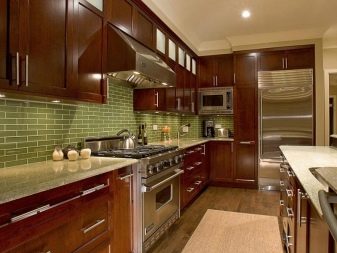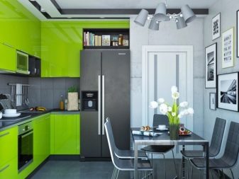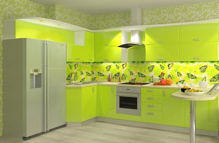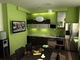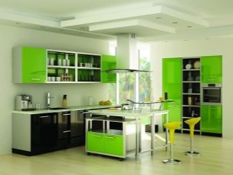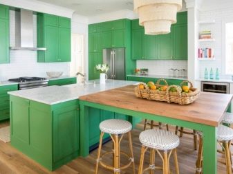 - Green. Bright and juicy green tones of the kitchen are becoming more and more popular, which is explained by the pacifying nature of the shade and its rich colors. Correctly filling the space with green, you can get a spacious, bright, living room, where it will be nice to be, easy to breathe and eat with appetite.