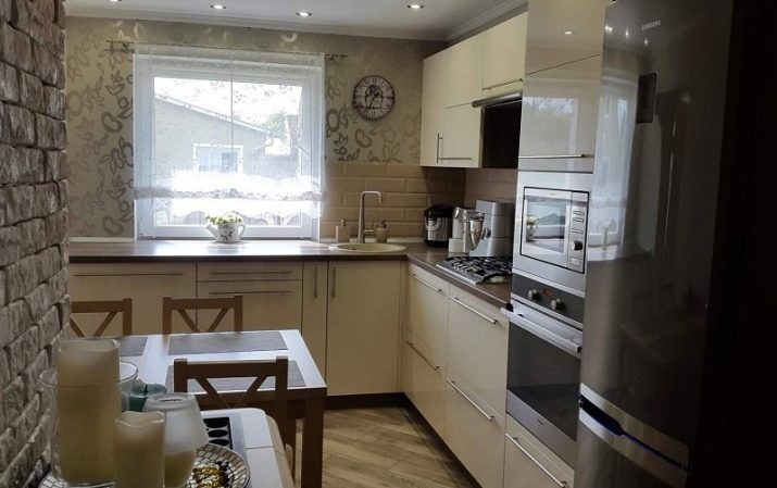 For a small kitchen, the most acceptable shades are light and bright, which visually expand the boundaries of space and highlight certain areas. The combination of the color of the wallpaper pattern and the headset is a good way to create a holistic room with an original design.