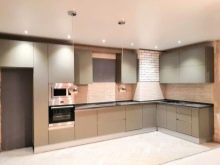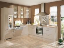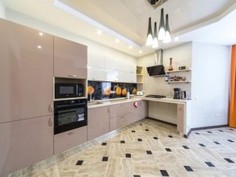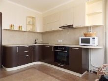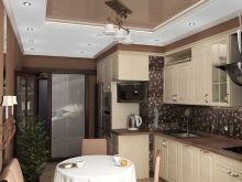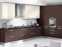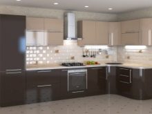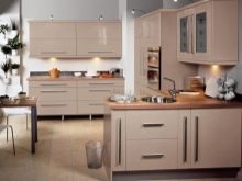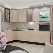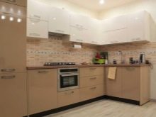 Combines a soft, muted color of coffee on the gloss of the floor tables with a matte surface of the hinged sections of delicate pastel color. The walls are painted in warm beige, the floor is covered with linoleum to match the floor cabinets with darker splashes. The space between the work surface and the wall cabinets - an apron - is made in a transitional combination of coffee and vanilla headset design.