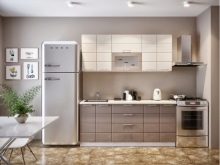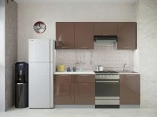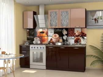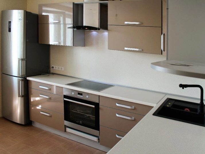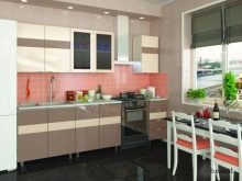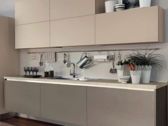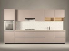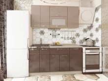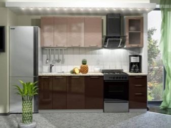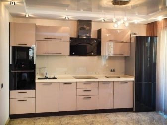 Single row a cappuccino-style kitchen will look more elegant if you add black color, for example, household appliances: a refrigerator, an extractor hood, an oven. In combination with pink or white tones, headsets of this kind look original and fresh.