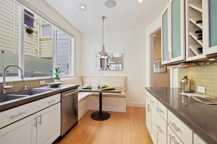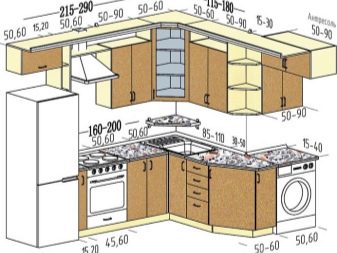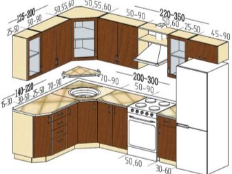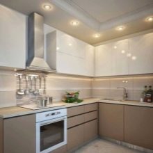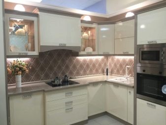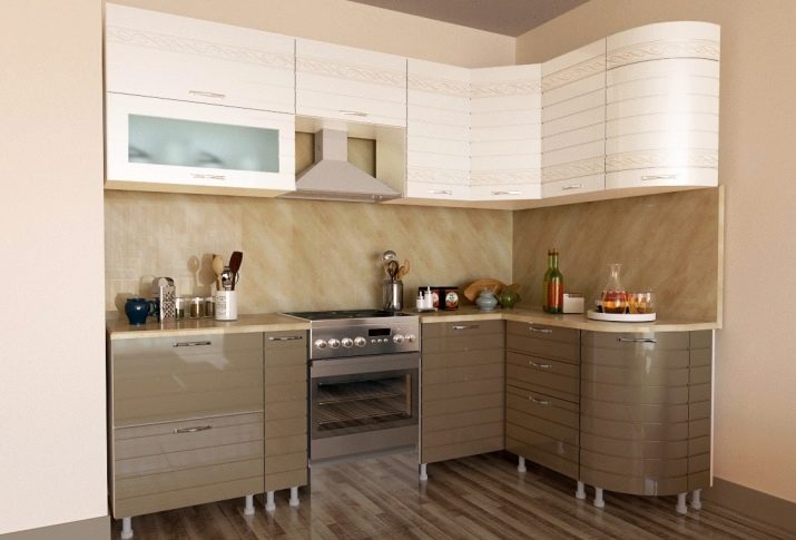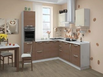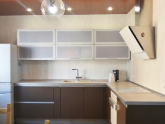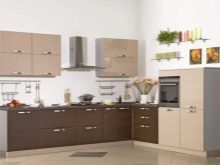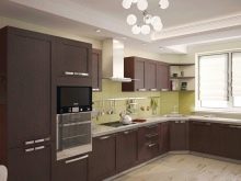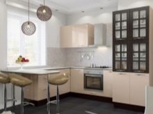 For angular kitchen sets are advised to use contrasting decor: one part of the cabinets should be made in a lighter range, the other in a darker one. So, you can make the upper part more airy, and the lower - less mark. Zoning different areas is also an interesting idea, for example, to separate the working and dining parts.
