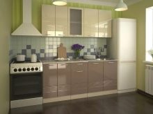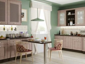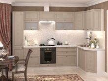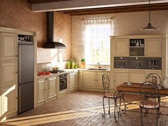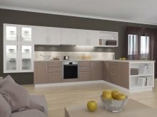 To create a touch of style provence or country prefer light furniture, and coffee with milk will be very useful in such a design. Matte facades are finished with gratings, planks, decorative cornices, with and without glass. As a rule, the furniture is decorated in one color, but you can highlight the island or peninsula, making 1-2 tones lighter than the entire set.