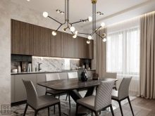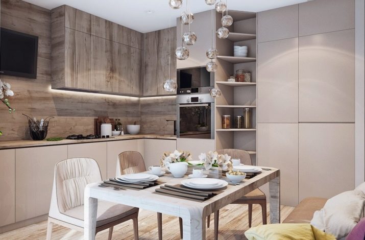 A prime example of cappuccino furniture with wood trim. Designers use different textures and tones in the headset: milky accents are shifted to the dining table, the corner zone is slightly darkened. This is facilitated by wood surfaces and a more coffee shade. The emphasis is on textiles - dark chocolate napkins and transparent spheres above the table.