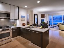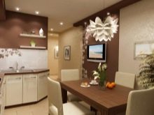 Minimalism gravitates to strict tones, soft coffee with milk is suitable for a laconic and strict interior. For contrast, it is better to use a coffee palette: a combination of chocolate cabinets and pastel wall cabinets. Please note that dark range complements the general decor, serves for zoning the space.