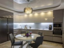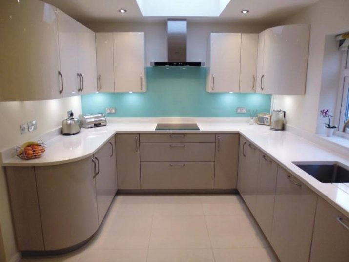 The glossy facades of the upper cabinets and the matt surface of the lower cabinets give the impression of a room opening upwards. Rounded facades and white countertops to paint the walls create a feeling of airiness. Tiffany color successfully combines with the rest, attracts the eye and expands the format of the room. The lighting on the ceiling and cabinets only enhances the effect of a spacious environment.