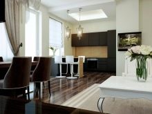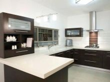 In a white kitchen studio, chocolate-colored furniture will help separate the space for the cooking process.