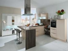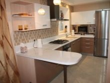 Headsets with a peninsula look great in one color and in a combination of two or three. Nevertheless, it must be taken into account that brightened options and combinations make the furniture more weightless, thereby expanding the area. For small rooms it is better to choose cabinets and cabinets with light fragments (doors, countertops), dark options are perfect for large kitchens, or combined with the living room, where there is a lot of free space.
