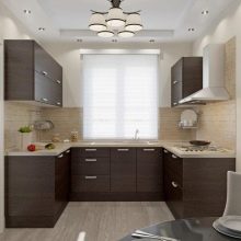 For small rooms U-shaped coffee kitchens are best chosen in a pastel version. Chocolate tones are recommended to be combined with light walls, ceilings and other elements. An excellent choice with dark facades will be light countertops and wall cabinets.