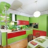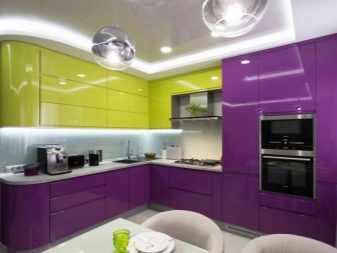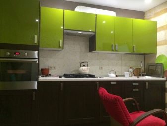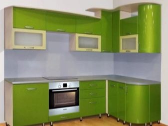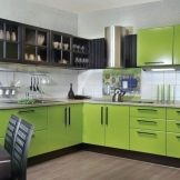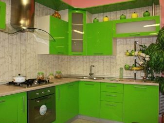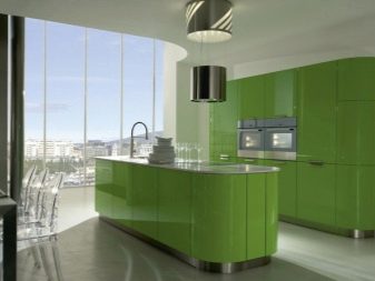 When buying a green headset, it is very difficult to choose between glossy and matte. Glossy is most often used in the design of small spaces - Such furniture visually expands the space, making it more voluminous and light. Matte headsets in small kitchens do not look so impressive, but they also bring a little cosiness and warmth to the atmosphere.