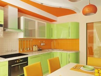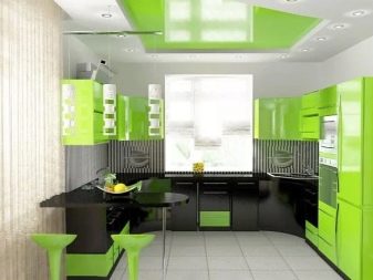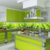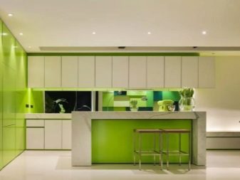 - High tech. An ultra-modern style that combines glass and metal. Most often, black and white combinations are used in it, but the lime shade will bring fresh notes and dilute the strict impeccability of the kitchen-living room. Usually a glass apron of green shades looks good in this style.