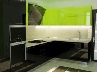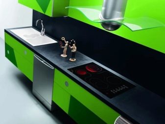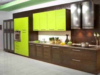 Lime green contrasts with blackbut to prevent the kitchen from looking too gloomy, they add golden or white shades to it. For example, the desired effect can be achieved by installing an additional light source of a yellow spectrum.