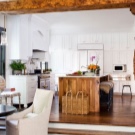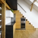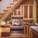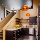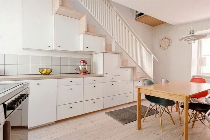 It may seem to some that it is very difficult to equip a kitchen with a staircase to the second floor. But in fact, this feature of building a house allows you to make an additional storage system for kitchen utensils. Under the stairs, you can place built-in wardrobes and even install small household appliances. In another version of the interior design, it is planned to place the dining area under the flight of stairs. As lighting devices, it is worth considering spotlights or sconces. The working area of the kitchen set, located under the flight of stairs, will be very interesting. In this case, the staircase should adjoin the wall.