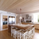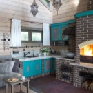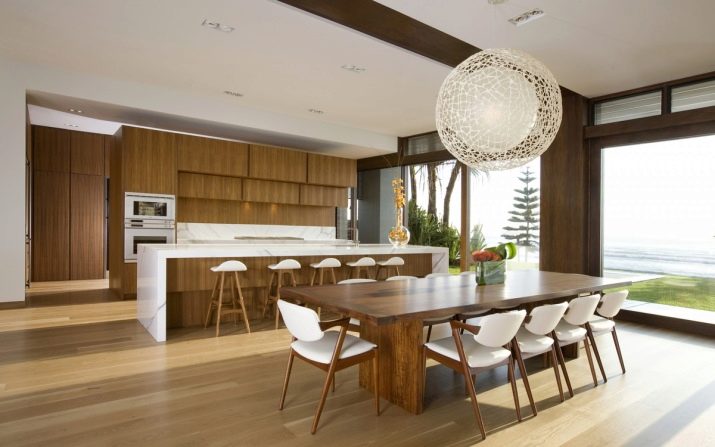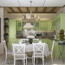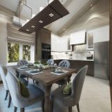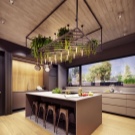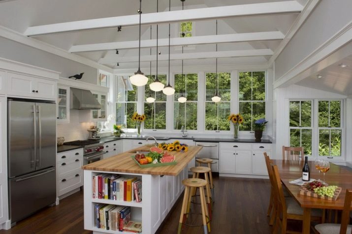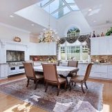 - First you need to decide on the style of the interior of the future kitchen. As a basis, you can take the taste preferences of the owners of the house or build on the design of the facade of the cottage. In rare cases, attention is drawn to historical data about the land where the house stands. So, for example, in mansions with brick or stone cladding, it is more appropriate to make a classic kitchen.In buildings made of wood, it is preferable to use the styles of country, Provence, eco, shabby chic and Russian cottage. Modern houses with panoramic windows are best designed in Scandinavian style or minimalism. In houses near the water, the marine style of decoration will be appropriate.
