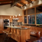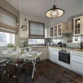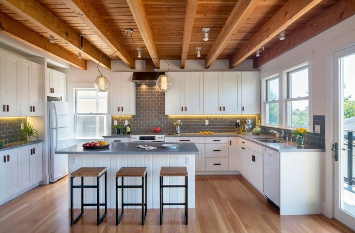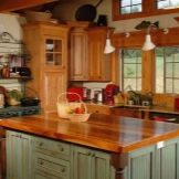 To finish the kitchen space in a private house, there are much more opportunities than in the kitchens of city apartments. The main conditions for the manifestation of fantasy is the height of the room and the total area of the room. And already create an interesting design will allow not only ceiling structures, but also the non-standard geometric shape of the room. In addition, choosing the decoration option, the owner pays attention not only to his desires and needs, but also to the interior of the rest of the house, as well as to the design of its facade. For example, in a wooden estate, the kitchen made in eco-style, where the main material is also wood, will be most interesting. An additional decoration of the room will be the stone finish of the working area.