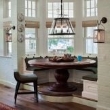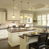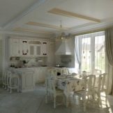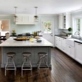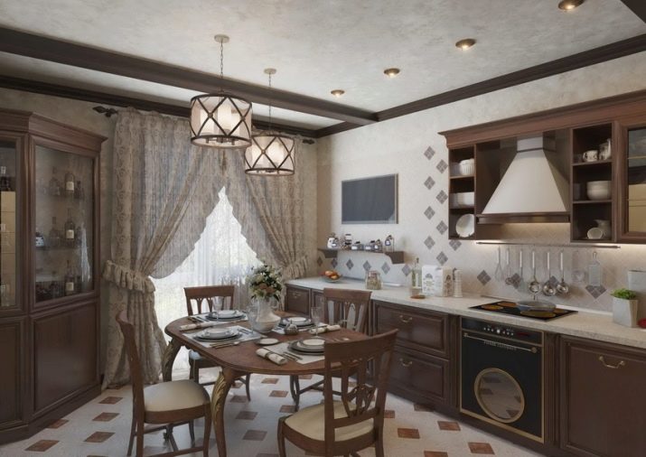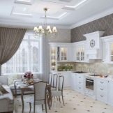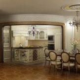 The most revered option for the design of the kitchen space. When creating it, dark furniture is used - a dining table made of natural wood, high chairs with soft upholstery. It is advisable to enlarge the window opening to the floor and hang elegant curtains made of thick fabric on it. The walls of the classic kitchen are papered. In the working area, they must be washable.To create an atmosphere of comfort near the dining table, you can install a fireplace.