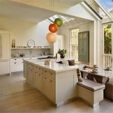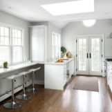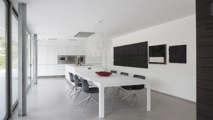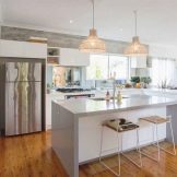 For a walk-through room, it is better to plan a parallel layout of the kitchen set. The interior, equipped with a large panoramic window or access to the backyard, will look especially chic. The width of the room will seem narrow, but thanks to its elongated part, this feature of the interior will be invisible. It will turn out to be a convenient rectangular table in the center where a large family can spend time together.