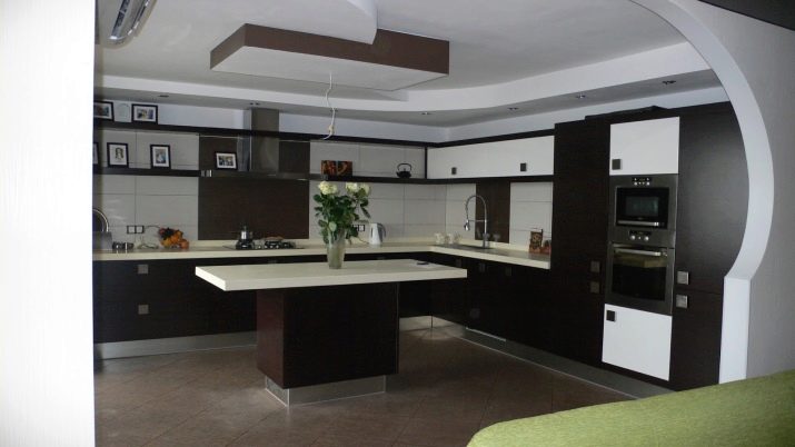 Different methods of zoning the kitchen space are used in rooms with a rectangular and square shape. The distinction can be made using a two-level ceiling, for example, the combination of a suspended and suspended structure, or multi-level ceiling. At the same time, lighting devices allow you to focus on each individual zone. So, for example, two-level ceilings allow you to install spot lighting above the working surface, and make diffused light in the dining area. The same applies to the rectangular shape of the room.