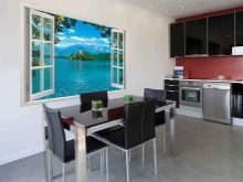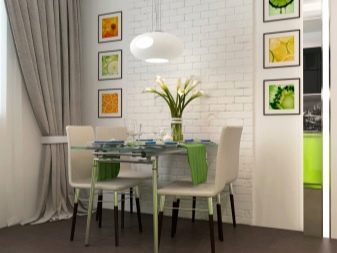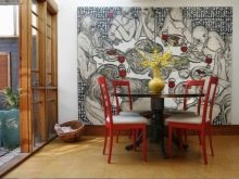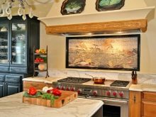 As a rule, the picture is hung in the dining area above the table or on a free section of the wall opposite the window. However, there are a sufficient number of creative solutions that create a unique interior. Alternatively, a stylish poster under the glass can be placed in the washing area behind the tap.