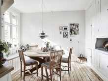 - Scandinavian style in the interior becomes an excellent backdrop for various artistic manifestations. The dining area is decorated with several black-and-white works, cleaned under glass in strict black frames. All of them are vertical, 3 are of the same size, and 1 is much larger. At the window right in the working area there is an unusual picture resembling a page from an old book.
