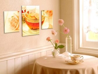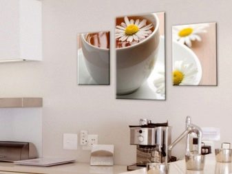 The theme of kitchen paintings, in fact, is not so numerous. Most often, a still life or landscape is chosen, since they, on the one hand, are quite neutral, and on the other hand, they decorate the room and create a pleasant atmosphere. For example, it can be a fruit basket, a cup of coffee or a bouquet of peonies. A couple of glasses of wine or cafe windows with fresh pastries have a good effect on appetite.