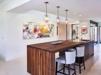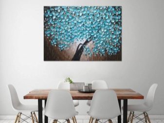 The main rule for placing pictures in the kitchen implies that they should be located as far as possible from the stove. The cooking zone is a place in which temperature fluctuations constantly occur, as well as vapors stand out, splashes of water and fat appear, to clear the picture of which is quite difficult. The height of the decorative element is usually determined depending on the level of the eyes. But since there are standing people in the kitchen, preparing food, as well as sitting at the dining table, the exact choice should be made depending on your own preferences.