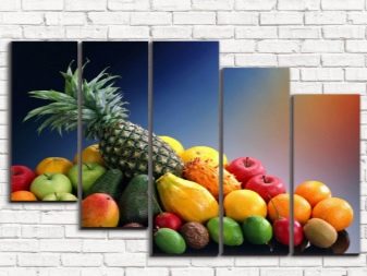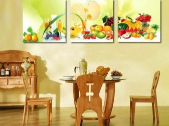 In a brightly colored kitchen, it is important to consider the most saturated colors: walls, an apron or a modular headset. In addition, the larger the room, the larger the paintings themselves should be. If we turn to the Feng Shui doctrine, it says that in the kitchen area it is important to avoid scenes of violence and misfortune, for example, volcanoes, sinking ships or suffering people. In addition, banned predators cracking down on prey, or dragons spewing flame. Soothing images of animals and nature, couples in love or beautiful still lifes are welcome. It is important to have red elements, for example, flowers or fruits, as well as green details: fields or forests.