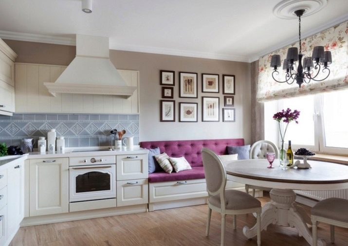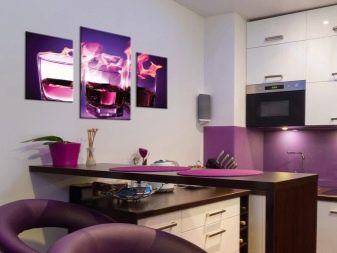 - The picture in the interior of the kitchen may not be one or even two, but as many as 10.The composition of the images, located above the sofa, despite the seeming randomness, is logically organized. Frames of different sizes are placed in such a way that they form a neat rectangle. Moreover, the existing columns slightly mirror each other. All the images are different, but the theme is the same: one way or another, they are related to the kitchen and cooking. The calm composition successfully balances the bright purple sofa.