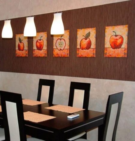 - A fairly simple but stylish solution arises when using 5 different paintings with the image of the same apple. Perfectly chosen themes correspond to the demands of the kitchen space and create the required atmosphere. Bright warm colors turn out to be an appropriate emphasis on a rather calm wall of a brown hue. The location near the fixtures provides the necessary illumination, and the dining table nearby makes it possible for travelers to enjoy a work of art. Finally, 5 paintings instead of one not only allow you to fill a rather long wall, but also look much more interesting.