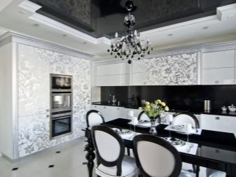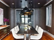 Creating a dark ceiling in the kitchen, many designers do not seek sharp contrasts, but rather try to “soften” the rich black tone. In this case, a pastel color wallpaper with a delicate matte pattern will be an excellent solution.
